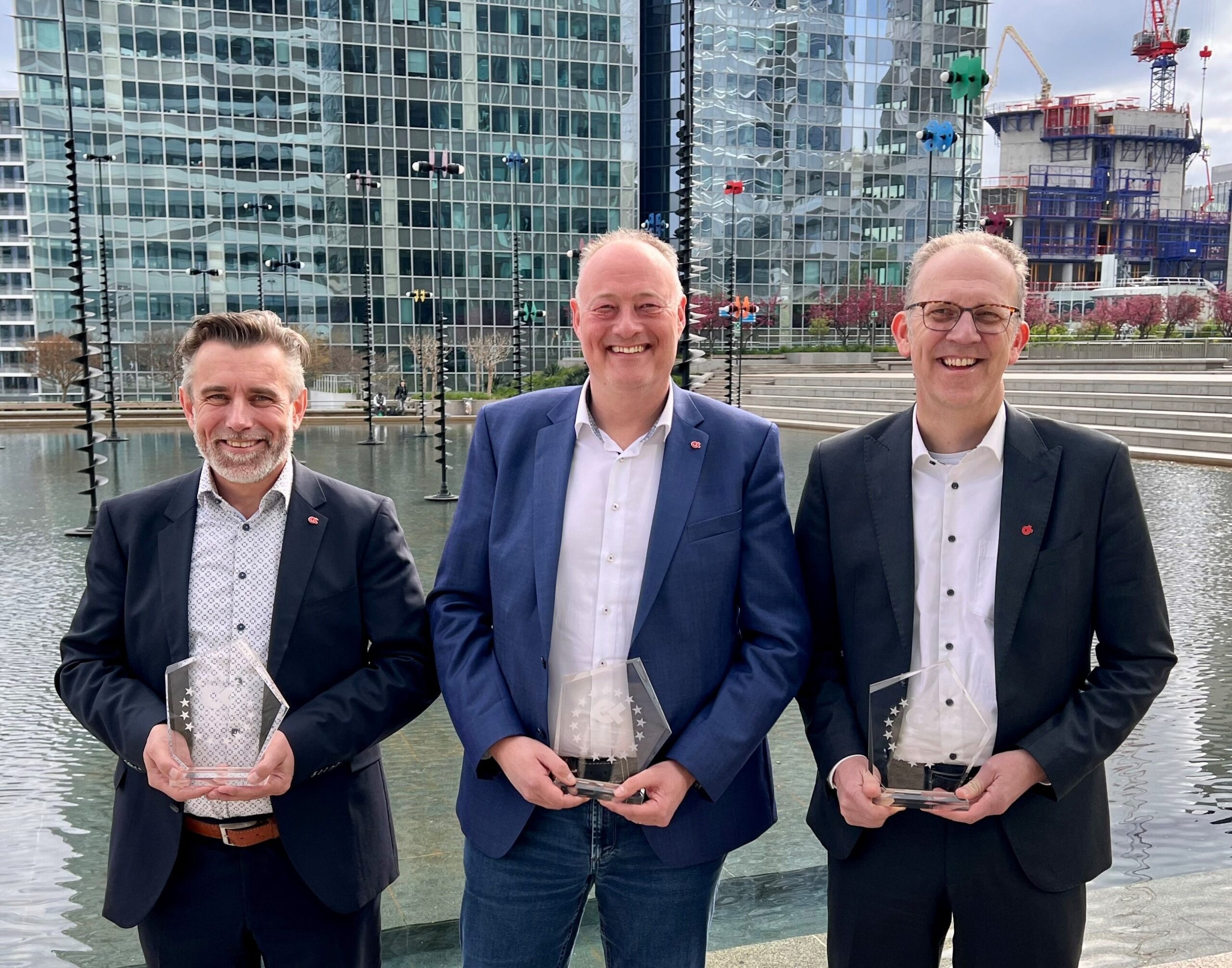 (V. l. n. r.): Christian Bamminger (Koordination CargoLine, Leitung Deutschland/Niederlande) vom zweiten Sieger Englmayer (Österreich), Markus Weber, Niederlassungsleiter beim allgemeinen Spitzenreiter und darüber hinaus Qualitätssieger Lebert (Schweiz), und Marco de Jong vom Drittplatzierten Van Duuren zeigen nach der Auszeichnung als „Internationaler CargoLine-Partner des Jahres 2022“ hoch erfreut ihre Pokale.